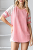 Light Pink Spiral Ribbed Texture Lace Color Block Short Sleeve Top LC25229051-P1010